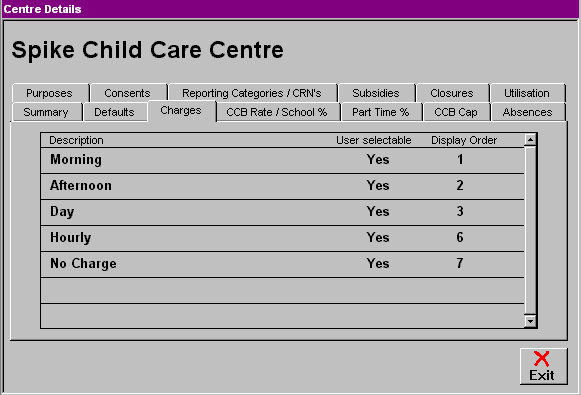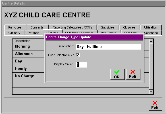 Select whether you wish the Charge Type to be a sessional charge (fixed arrival and departure times with a fixed price for attendance between those times),an hourly charge (unlimited times and charged by the hour) or a no charge (no matter what the booking, it will not be charged).