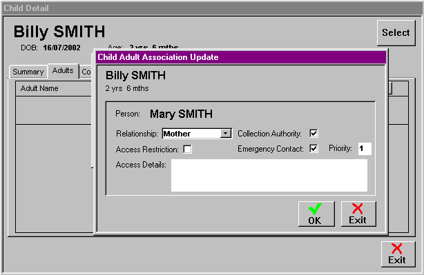 The first process is to enter the names and details of adults associated with a particular child, their relationship, emergency contact priority number and any access restrictions that may apply