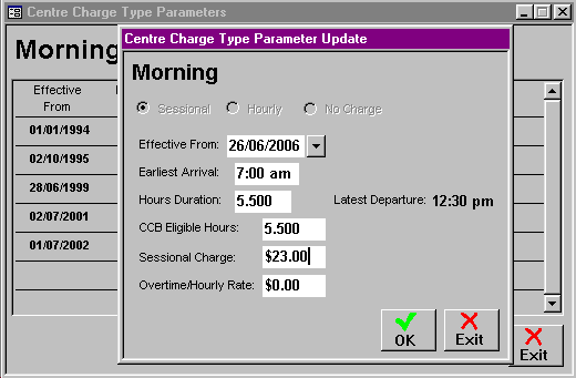 Select whether you wish the Charge Type to be a sessional charge (fixed arrival and departure times with a fixed price for attendance between those times),an hourly charge (unlimited times and charged by the hour) or a no charge (no matter what the booking, it will not be charged).